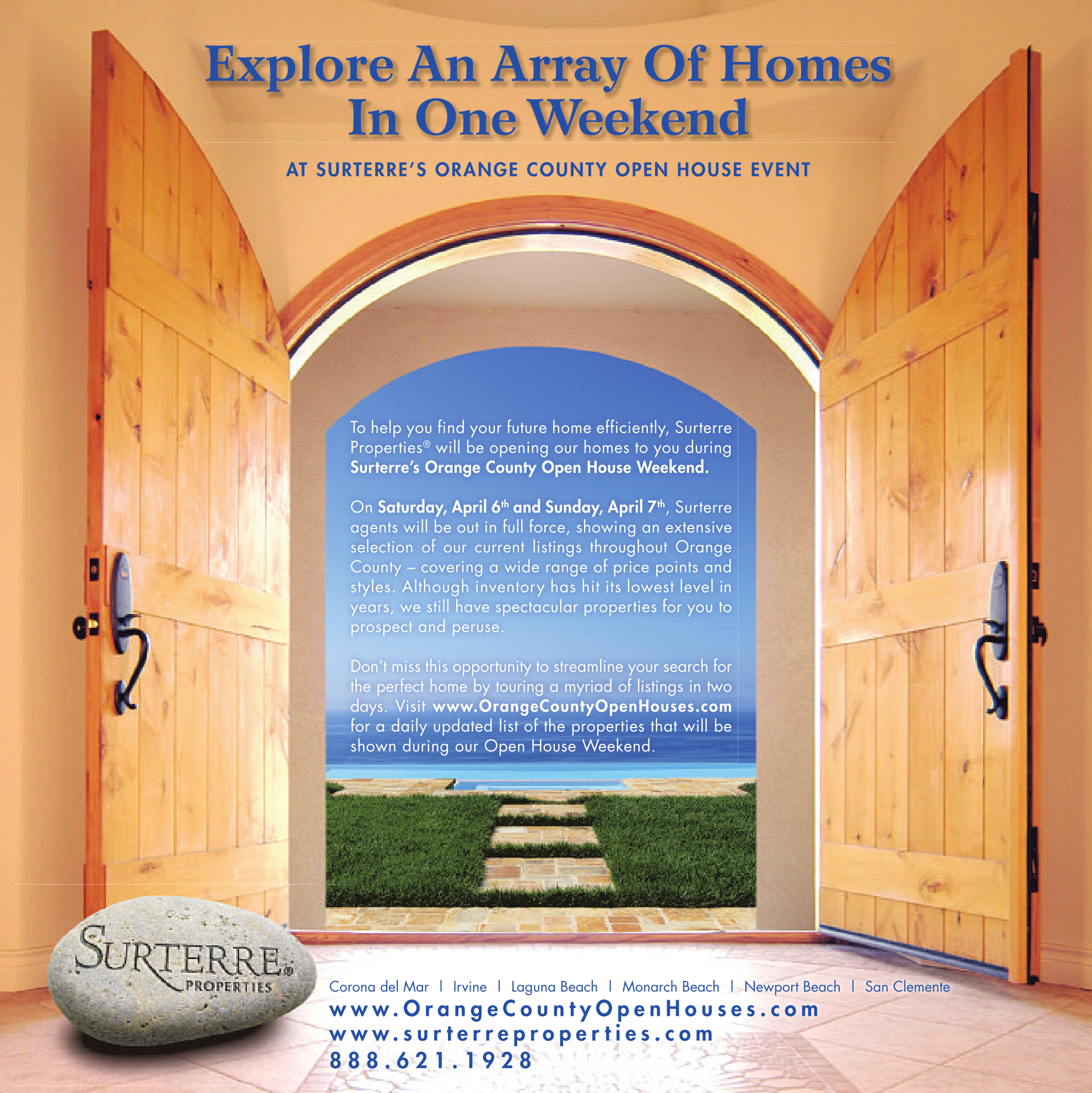 On Saturday, April 6 th and Sunday, April 7 th , Surterre agents will be out in full force, showing an extensive selection of our current listings throughout Orange County – covering a wide range of price points and styles. Although inventory has hit its lowest level in years, we still have spectacular properties for you to prospect and peruse.