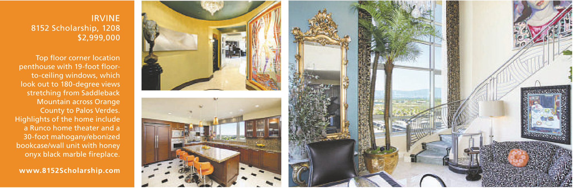 Top floor corner location penthouse with 19-foot floorto-ceiling windows, which look out to 180-degree views stretching from Saddleback Mountain across Orange County to Palos Verdes.