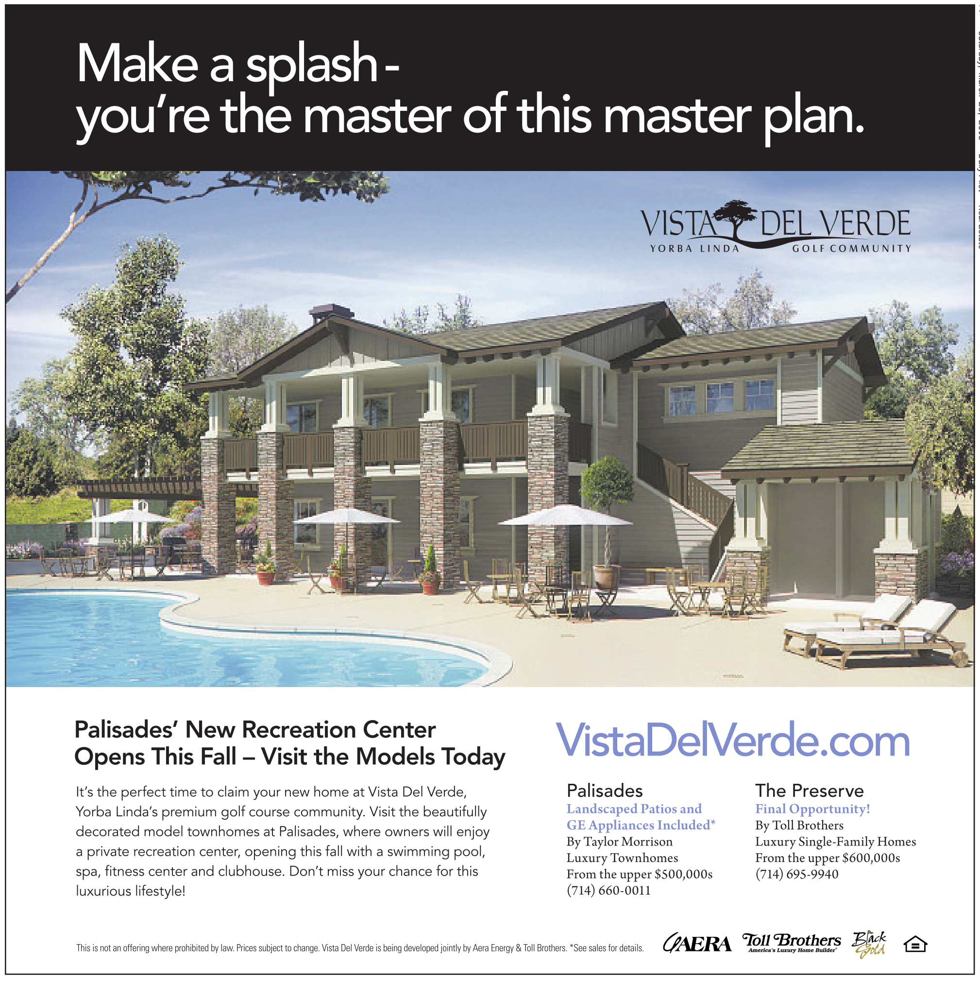 This is not an offering where prohibited by law.Prices subject to change. Vista Del Verde is being developed jointly by Aera Energy &Toll Brothers. *See sales for details.