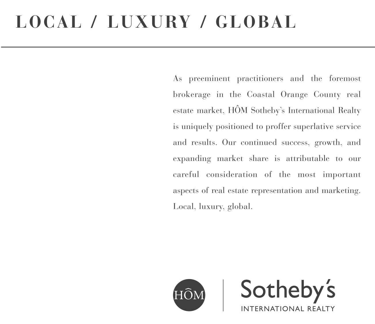 As preeminent practitioners and the foremost brokerage in the Coastal Orange County real estate market, HÔM Sotheby’s International Realty is uniquely positioned to proffer superlative service and results. Our continued success, growth, and expanding market share is attributable to our careful consideration of the most important aspects of real estate representation and marketing. Local, luxury, global.