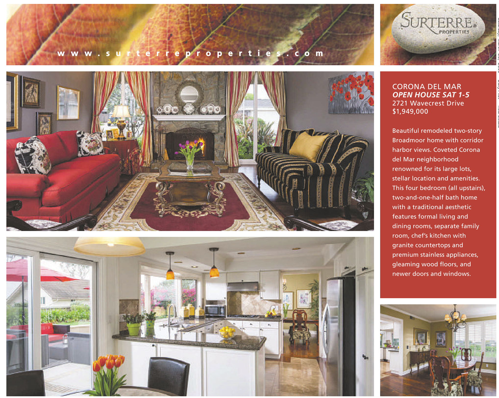 w w w . s u r t e r r e p r o p e r t i e s . c o m CORONA DEL MAR OPEN HOUSE SAT 1-5 2721 Wavecrest Drive $1,949,000 Beautiful remodeled two-story Broadmoor home with corridor harbor views. Coveted Corona del Mar neighborhood renowned for its large lots, stellar location and amenities. This four bedroom (all upstairs), two-and-one-half bath home with a traditional aesthetic features formal living and dining rooms, separate family room, chef’s kitchen with granite countertops and premium stainless appliances, gleaming wood floors, and newer doors and windows.