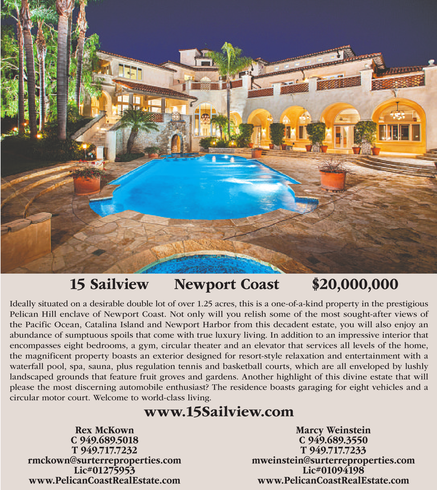 15 Sailview Newport Coast $20,000,000 Ideally situated on a desirable double lot of over 1.25 acres, this is a one-of-a-kind property in the prestigious Pelican Hill enclave of Newport Coast. Not only will you relish some of the most sought-after views of the Pacific Ocean, Catalina Island and Newport Harbor from this decadent estate, you will also enjoy an abundance of sumptuous spoils that come with true luxury living. In addition to an impressive interior that encompasses eight bedrooms, a gym, circular theater and an elevator that services all levels of the home, the magnificent property boasts an exterior designed for resort-style relaxation and entertainment with awaterfall pool, spa, sauna, plus regulation tennis and basketball courts, which are all enveloped by lushly landscaped grounds that feature fruit groves and gardens. Another highlight of this divine estate that will please the most discerning automobile enthusiast? The residence boasts garaging for eight vehicles and acircular motor court. Welcome to world-class living. Rex McKown C 949.689.5018 T 949.717.7232 rmckown@surterreproperties.com Lic#01275953 www.PelicanCoastRealEstate.com Marcy Weinstein C 949.689.3550 T 949.717.7233 mweinstein@surterreproperties.com Lic#01094198 www.PelicanCoastRealEstate.com