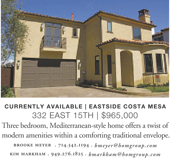 CURRENTLY AVAILABLE | EASTSIDE COSTA MESA 332 EAST 15TH | $965,000 Three bedroom, Mediterranean-style home offers atwist of modern amenities within acomforting traditional envelope. brooke meyer . 714.342.1194 . bmeyer@homgroup.com kim markham . 949.276.1825 . kmarkham@homgroup.com