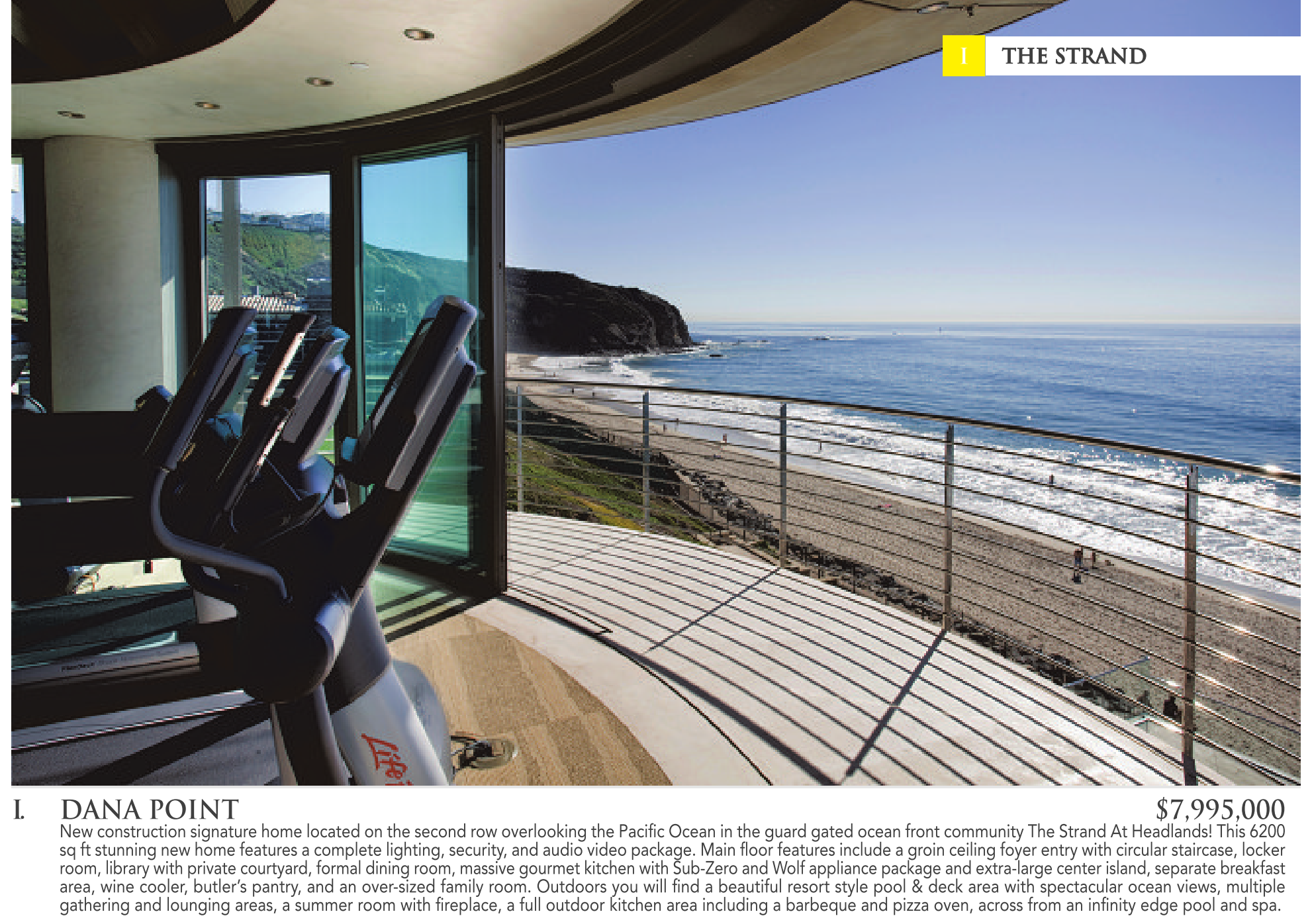 New construction signature home located on the second row overlooking the Pacific Ocean in the guard gated ocean front community The Strand At Headlands! This 6200 sq ft stunning new home features a complete lighting, security, and audio video package. Main floor features include a groin ceiling foyer entry with circular staircase, locker room, library with private courtyard, formal dining room, massive gourmet kitchen with Sub-Zero and Wolf appliance package and extra-large center island, separate breakfast area, wine cooler, butler’s pantry, and an over-sized family room. Outdoors you will find a beautiful resort style pool & deck area with spectacular ocean views, multiple gathering and lounging areas, a summer room with fireplace, a full outdoor kitchen area including a barbeque and pizza oven, across from an infinity edge pool and spa.
