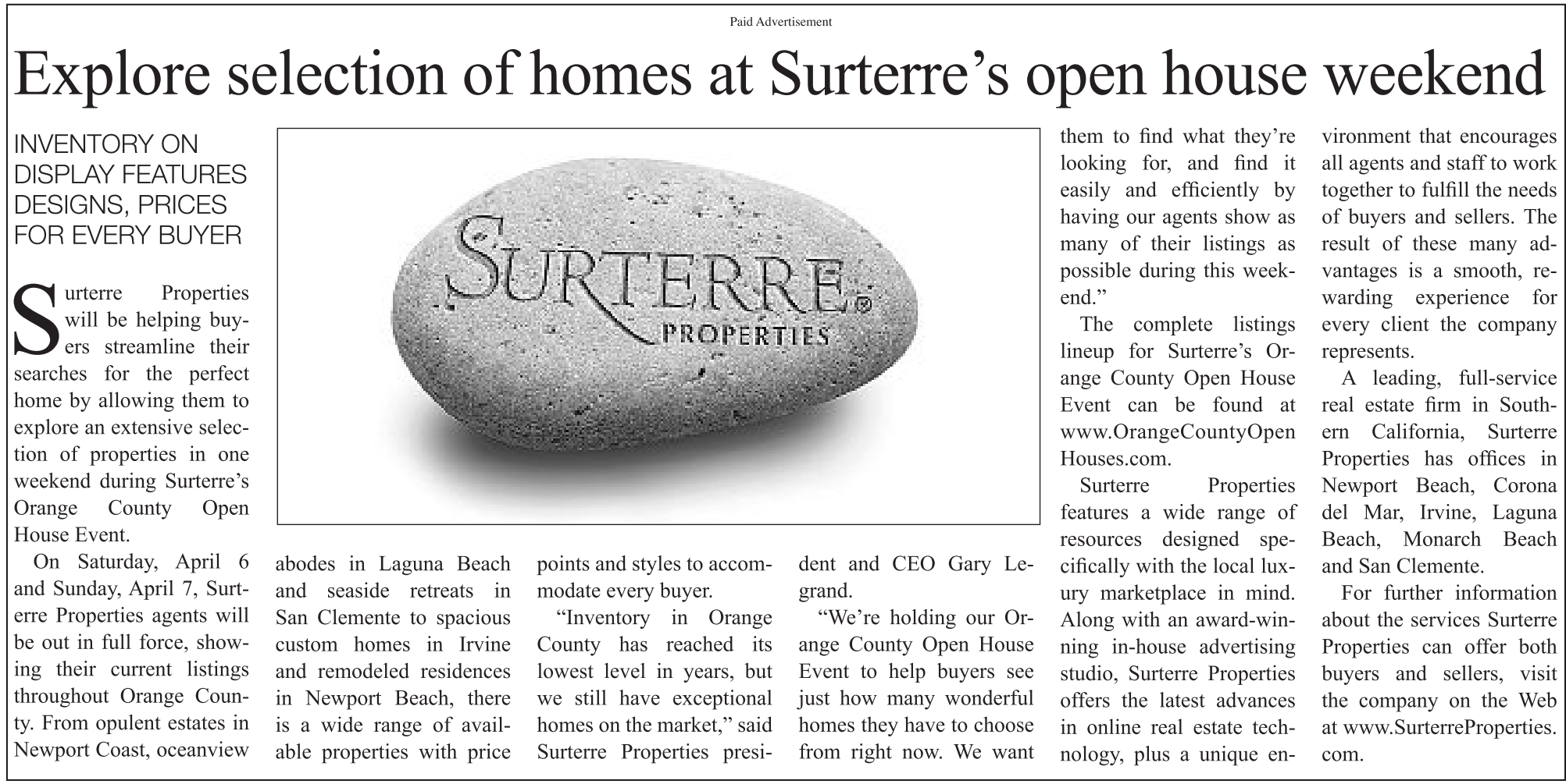 The complete listings lineup for Surterre’s Orange County Open House Event can be found at www.OrangeCountyOpen Houses.com.