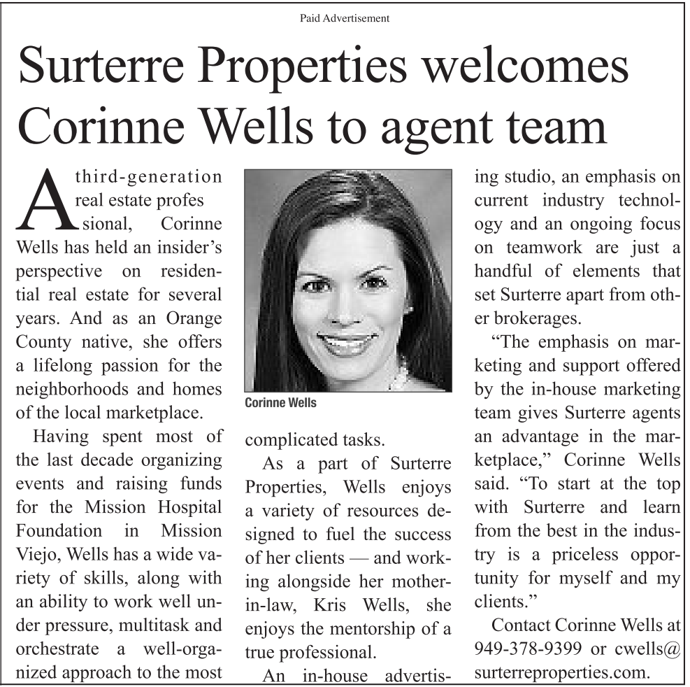 Athird-generation real estate profes sional, Corinne Wells has held an insider’s perspective on residential real estate for several years. And as an Orange County native, she offers a lifelong passion for the neighborhoods and homes of the local marketplace. Having spent most of the last decade organizing events and raising funds for the Mission Hospital Foundation in Mission Viejo, Wells has a wide variety of skills, along with an ability to work well under pressure, multitask and orchestrate a well-organized approach to the most Paid Advertisement Surterre Properties welcomes Corinne Wells to agent team Corinne Wells complicated tasks. As a part of Surterre Properties, Wells enjoys a variety of resources designed to fuel the success of her clients — and working alongside her motherin-law, Kris Wells, she enjoys the mentorship of a true professional. An in-house advertis ing studio, an emphasis on current industry technology and an ongoing focus on teamwork are just a handful of elements that set Surterre apart from other brokerages. “The emphasis on marketing and support offered by the in-house marketing team gives Surterre agents an advantage in the marketplace,” Corinne Wells said. “To start at the top with Surterre and learn from the best in the industry is a priceless opportunity for myself and my clients.” Contact Corinne Wells at 949-378-9399 or cwells@ surterreproperties.com.