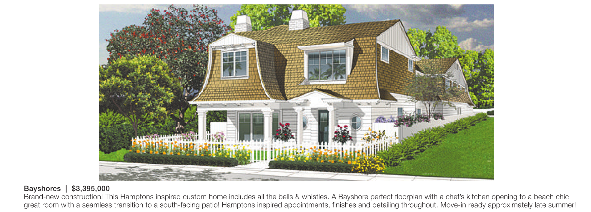 Bayshores | $3,395,000 Brand-new construction! This Hamptons inspired custom home includes all the bells & whistles. A Bayshore perfect floorplan with a chef’s kitchen opening to a beach chic great room with a seamless transition to a south-facing patio! Hamptons inspired appointments, finishes and detailing throughout. Move-in ready approximately late summer!