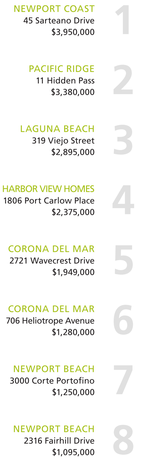 NEWPORT COAST 45 Sarteano Drive $3,950,000 PACIFIC RIDGE 11 Hidden Pass $3,380,000 1 2 LAGUNA BEACH 319 Viejo Street $2,895,000 3 HARBOR VIEW HOMES 1806 Port Carlow Place $2,375,000 4 CORONA DEL MAR 2721 Wavecrest Drive $1,949,000 5 CORONA DEL MAR 706 Heliotrope Avenue $1,280,000 6 NEWPORT BEACH 3000 Corte Portofino $1,250,000 7 NEWPORT BEACH 2316 Fairhill Drive $1,095,000 8