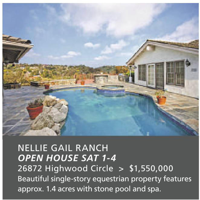 NELLIE GAIL RANCH OPEN HOUSE SAT 1-4 26872 Highwood Circle > $1,550,000 Beautiful single-story equestrian property features approx. 1.4 acres with stone pool and spa.