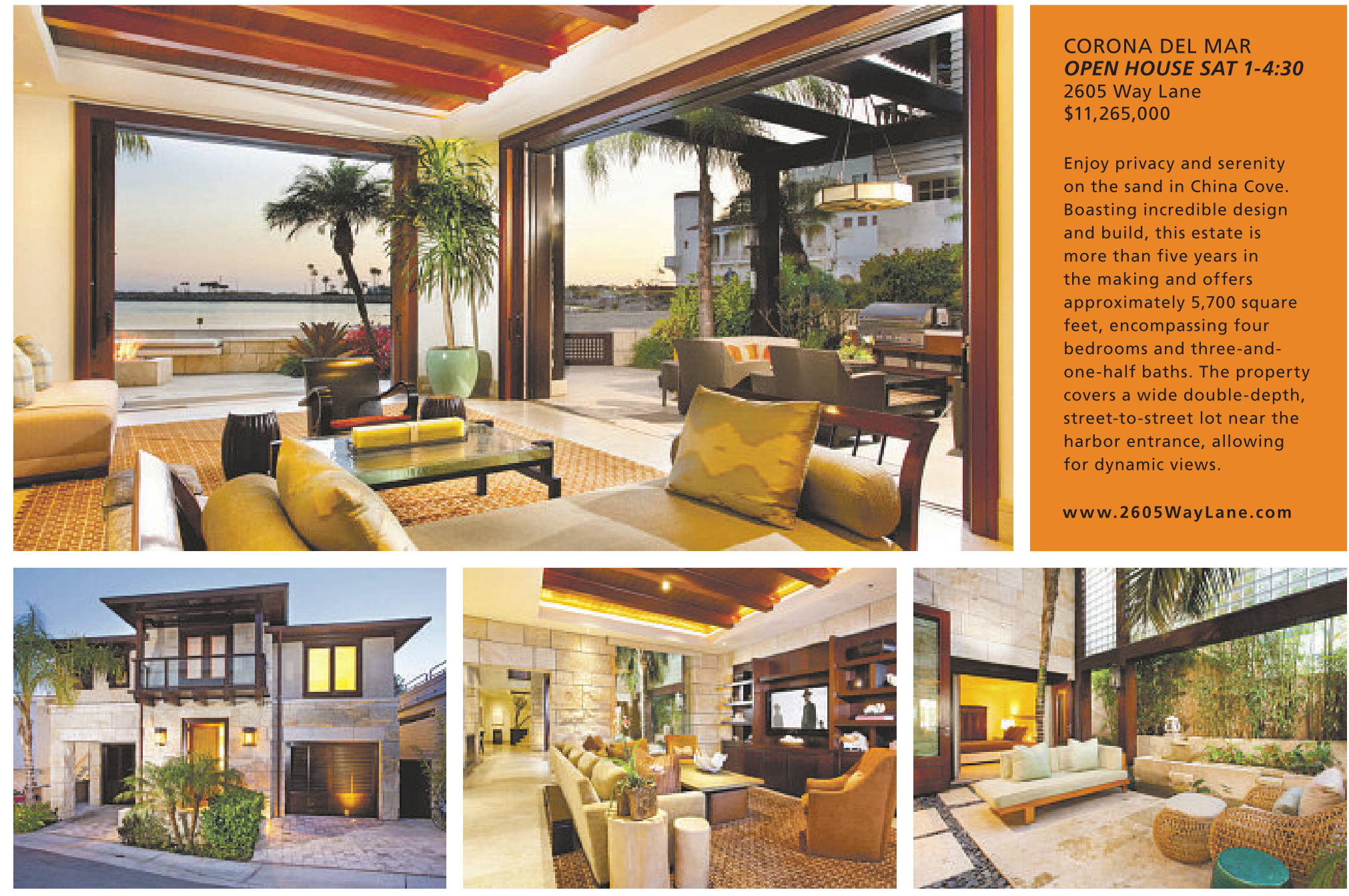 Enjoy privacy and serenity on the sand in China Cove. Boasting incredible design and build, this estate is more than five years in the making and offers approximately 5,700 square feet, encompassing four bedrooms and three-andone-half baths. The property covers a wide double-depth, street-to-street lot near the harbor entrance, allowing for dynamic views.