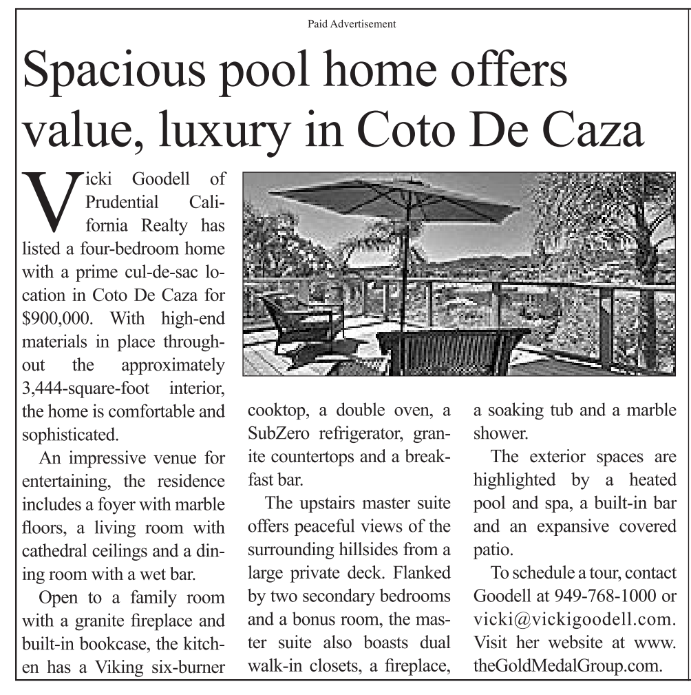 Goodell of Prudential California Realty has listed a four-bedroom home with a prime cul-de-sac location in Coto De Caza for $900,000. With high-end materials in place throughout the approximately 3,444-square-foot interior, the home is comfortable and sophisticated.