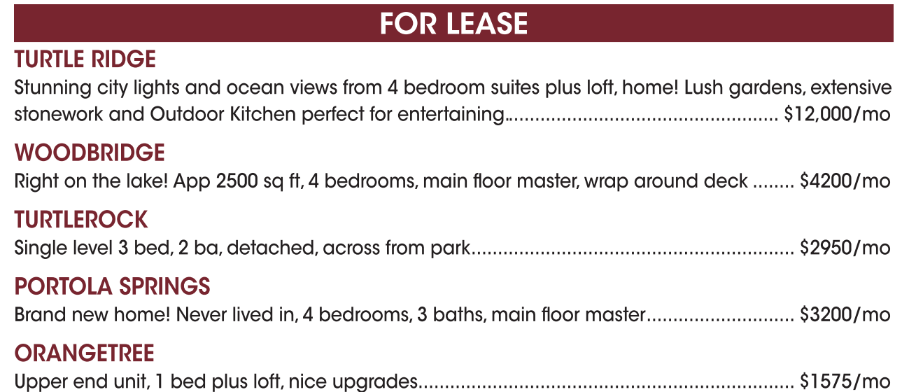 FOR LEASE TURTLE RIDGE Stunning city lights and ocean views from 4 bedroom suites plus loft, home! Lush gardens,extensive stonework and Outdoor Kitchen perfect for entertaining.................................................... $12,000/mo WOODBRIDGE Right on the lake! App 2500 sq ft, 4 bedrooms,main floor master,wrap around deck ........ $4200/mo TURTLEROCK Single level 3 bed, 2 ba, detached, across from park............................................................. $2950/mo PORTOLA SPRINGS Brand new home! Never lived in, 4 bedrooms,3 baths,main floor master............................ $3200/mo ORANGETREE Upper end unit, 1 bed plus loft, nice upgrades....................................................................... $1575/mo