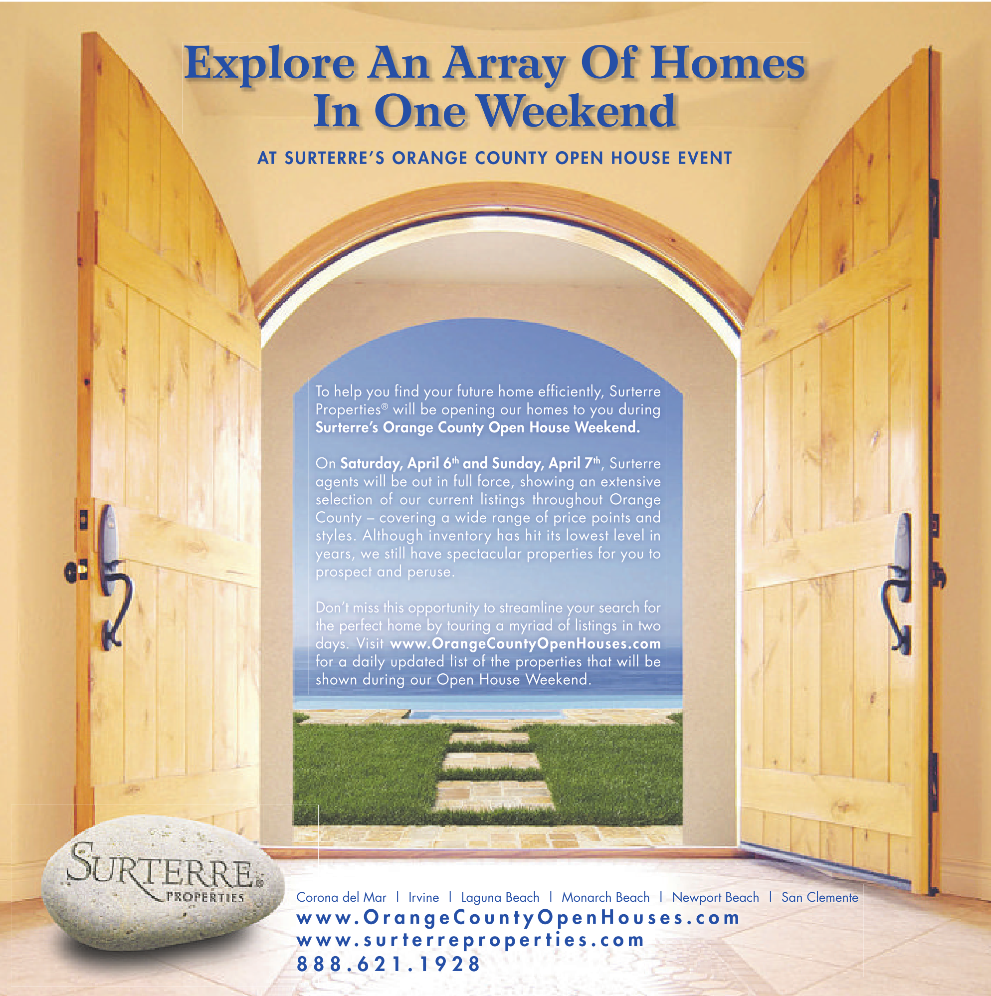 On Saturday, April 6 th and Sunday, April 7 th , Surterre agents will be out in full force, showing an extensive selection of our current listings throughout Orange County – covering a wide range of price points and styles. Although inventory has hit its lowest level in years, we still have spectacular properties for you to prospect and peruse.