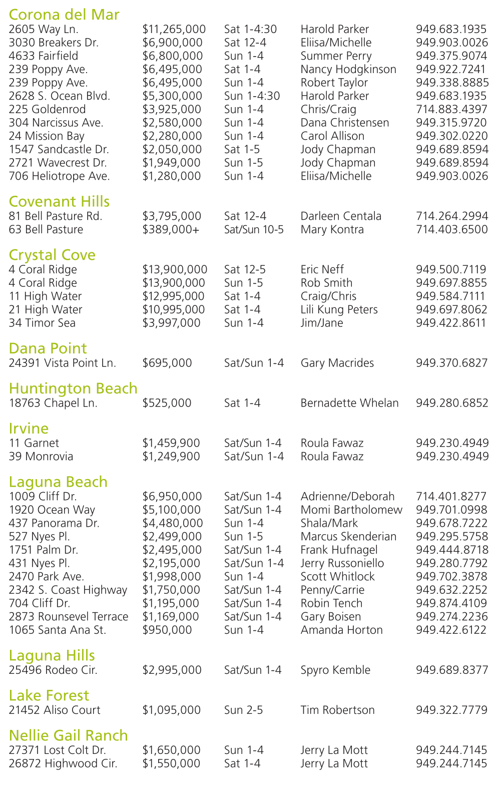 Corona del Mar 2605 Way Ln. $11,265,000 Sat 1-4:30 Harold Parker 949.683.1935 3030 Breakers Dr. $6,900,000 Sat 12-4 Eliisa/Michelle 949.903.0026 4633 Fairfield $6,800,000 Sun 1-4 Summer Perry 949.375.9074 239 Poppy Ave. $6,495,000 Sat 1-4 Nancy Hodgkinson 949.922.7241 239 Poppy Ave. $6,495,000 Sun 1-4 Robert Taylor 949.338.8885 2628 S. Ocean Blvd. $5,300,000 Sun 1-4:30 Harold Parker 949.683.1935 225 Goldenrod $3,925,000 Sun 1-4 Chris/Craig 714.883.4397 304 Narcissus Ave. $2,580,000 Sun 1-4 Dana Christensen 949.315.9720 24 Mission Bay $2,280,000 Sun 1-4 Carol Allison 949.302.0220 1547 Sandcastle Dr. $2,050,000 Sat 1-5 Jody Chapman 949.689.8594 2721 Wavecrest Dr. $1,949,000 Sun 1-5 Jody Chapman 949.689.8594 706 Heliotrope Ave. $1,280,000 Sun 1-4 Eliisa/Michelle 949.903.0026 Covenant Hills 81 Bell Pasture Rd. $3,795,000 Sat 12-4 Darleen Centala 714.264.2994 63 Bell Pasture $389,000+ Sat/Sun10-5 Mary Kontra 714.403.6500 Crystal Cove 4 Coral Ridge $13,900,000 Sat 12-5 Eric Neff 949.500.7119 4 Coral Ridge $13,900,000 Sun 1-5 Rob Smith 949.697.8855 11 High Water $12,995,000 Sat 1-4 Craig/Chris 949.584.7111 21 High Water $10,995,000 Sat 1-4 Lili Kung Peters 949.697.8062 34 Timor Sea $3,997,000 Sun 1-4 Jim/Jane 949.422.8611 Dana Point 24391 Vista Point Ln. $695,000 Sat/Sun 1-4 Gary Macrides 949.370.6827 Huntington Beach 18763 Chapel Ln. $525,000 Sat 1-4 Bernadette Whelan 949.280.6852 Irvine 11 Garnet $1,459,900 Sat/Sun 1-4 Roula Fawaz 949.230.4949 39 Monrovia $1,249,900 Sat/Sun 1-4 Roula Fawaz 949.230.4949 Laguna Beach 1009 Cliff Dr. $6,950,000 Sat/Sun 1-4 Adrienne/Deborah 714.401.8277 1920 Ocean Way $5,100,000 Sat/Sun 1-4 Momi Bartholomew 949.701.0998 437 Panorama Dr. $4,480,000 Sun 1-4 Shala/Mark 949.678.7222 527 Nyes Pl. $2,499,000 Sun 1-5 Marcus Skenderian 949.295.5758 1751 Palm Dr. $2,495,000 Sat/Sun 1-4 Frank Hufnagel 949.444.8718 431 Nyes Pl. $2,195,000 Sat/Sun 1-4 Jerry Russoniello 949.280.7792 2470 Park Ave. $1,998,000 Sun 1-4 Scott Whitlock 949.702.3878 2342 S. Coast Highway $1,750,000 Sat/Sun 1-4 Penny/Carrie 949.632.2252 704 Cliff Dr. $1,195,000 Sat/Sun 1-4 Robin Tench 949.874.4109 2873 Rounsevel Terrace $1,169,000 Sat/Sun 1-4 Gary Boisen 949.274.2236 1065 Santa Ana St. $950,000 Sun 1-4 Amanda Horton 949.422.6122 Laguna Hills 25496 Rodeo Cir. $2,995,000 Sat/Sun 1-4 Spyro Kemble 949.689.8377 Lake Forest 21452 Aliso Court $1,095,000 Sun 2-5 Tim Robertson 949.322.7779 Nellie Gail Ranch 27371 Lost Colt Dr. $1,650,000 Sun 1-4 Jerry La Mott 949.244.7145 26872 Highwood Cir. $1,550,000 Sat 1-4 Jerry La Mott 949.244.7145
