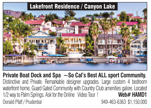 Lakefront Residence /Canyon Lake Private Boat Dock and Spa ~So Cal’s Best ALL sportCommunity. Distinctive and Private. Remarkable designer upgrades. Large custom 4 bedroom waterfront home, GuardGated Community with Country Club amenities galore. Located 1/2 way to Palm Springs. Ask for the Online Video Tour ! Web# HAMD1 Donald Pfaff /Prudential 949-463-6363 $1,150,000