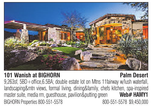 101 Wanish at BIGHORN Palm Desert 9,263sf, 5BD+office,6.5BA; double estate lot on Mtns 11fairway w/lush waterfall, landscaping&mtn views, formal living, dining&family, chefs kitchen, spa-inspired master suite, media rm, guesthouse, pavilion&putting green Web# HAMY1 BIGHORN Properties 800-551-5578 800-551-5578 $9,450,000