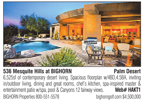 536 Mesquite Hills at BIGHORN Palm Desert BIGHORN Properties 800-551-5578 bighorngolf.com $4,500,000 6,525sf of contemporary desert living. Spacious floorplan w/4BD,4.5BA, inviting in/outdoor living, dining and great rooms, chef’s kitchen, spa-inspired master & entertainment patio w/spa, pool &Canyons 12 fairway views. Web# HAKT1