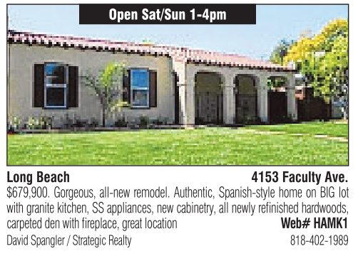 Long Beach Open Sat/Sun 1-4pm 4153 Faculty Ave. David Spangler /Strategic Realty 818-402-1989 $679,900. Gorgeous, all-new remodel. Authentic, Spanish-style home on BIG lot with granite kitchen, SS appliances, new cabinetry,all newly refinished hardwoods, carpeted den with fireplace, great location Web# HAMK1