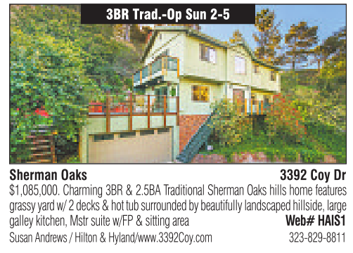 Sherman Oaks 3BR Trad.-Op Sun 2-5 $1,085,000. Charming 3BR &2.5BA Traditional Sherman Oaks hills home features grassy yardw/2decks &hot tub surrounded by beautifully landscaped hillside, large galley kitchen, Mstr suite w/FP &sitting area Web# HAIS1 Susan Andrews /Hilton &Hyland/www.3392Coy.com 323-829-8811 3392 Coy Dr