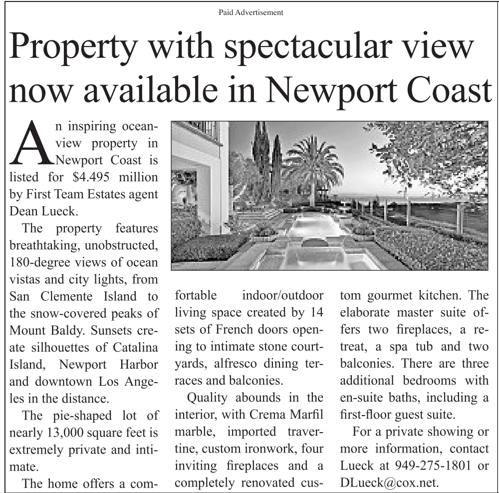 Property with spectacular view now available in Newport Coast Paid Advertisement An inspiring oceanview property in Newport Coast is listed for $4.495 million by First Team Estates agent Dean Lueck. The property features breathtaking, unobstructed, 180-degree views of ocean vistas and city lights, from San Clemente Island to the snow-covered peaks of Mount Baldy. Sunsets create silhouettes of Catalina Island, Newport Harbor and downtown Los Angeles in the distance. The pie-shaped lot of nearly 13,000 square feet is extremely private and intimate. The home offers a com fortable indoor/outdoor living space created by 14 sets of French doors opening to intimate stone courtyards, alfresco dining terraces and balconies. Quality abounds in the interior, with Crema Marfil marble, imported travertine, custom ironwork, four inviting fireplaces and acompletely renovated cus tom gourmet kitchen. The elaborate master suite offers two fireplaces, a retreat, a spa tub and two balconies. There are three additional bedrooms with en-suite baths, including afirst-floor guest suite. For a private showing or more information, contact Lueck at 949-275-1801 or DLueck@cox.net.
