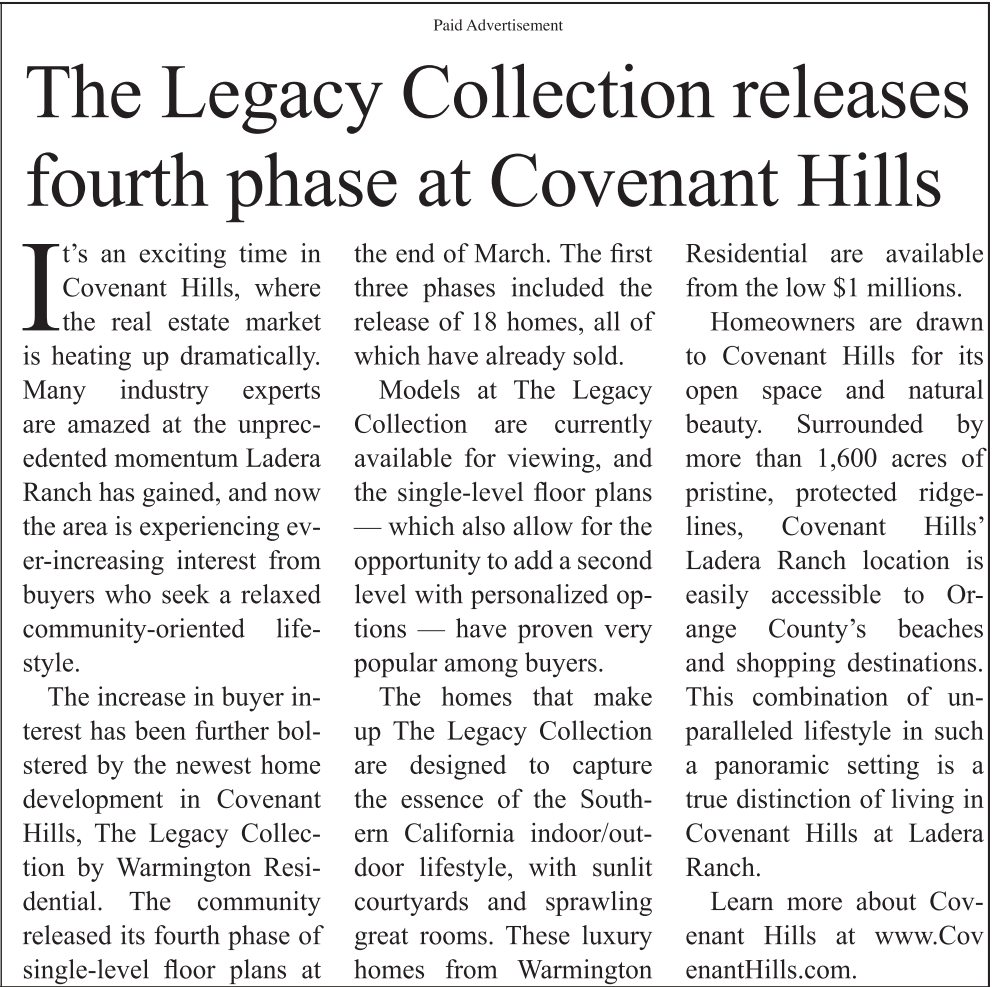 It’s an exciting time in Covenant Hills, where the real estate market is heating up dramatically. Many industry experts are amazed at the unprecedented momentum Ladera Ranch has gained, and now the area is experiencing ever-increasing interest from buyers who seek a relaxed community-oriented lifestyle. The increase in buyer interest has been further bolstered by the newest home development in Covenant Hills, The Legacy Collection by Warmington Residential. The community released its fourth phase of single-level floor plans at Paid Advertisement the end of March. The first three phases included the release of 18 homes, all of which have already sold. Models at The Legacy Collection are currently available for viewing, and the single-level floor plans — which also allow for the opportunity to add a second level with personalized options — have proven very popular among buyers. The homes that make up The Legacy Collection are designed to capture the essence of the Southern California indoor/outdoor lifestyle, with sunlit courtyards and sprawling great rooms. These luxury homes from Warmington The Legacy Collection releases fourth phase at Covenant Hills Residential are available from the low $1 millions. Homeowners are drawn to Covenant Hills for its open space and natural beauty. Surrounded by more than 1,600 acres of pristine, protected ridgelines, Covenant Hills’ Ladera Ranch location is easily accessible to Orange County’s beaches and shopping destinations. This combination of unparalleled lifestyle in such a panoramic setting is atrue distinction of living in Covenant Hills at Ladera Ranch. Learn more about Covenant Hills at www.Cov enantHills.com.