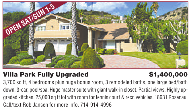 Villa Park Fully Upgraded $1,400,000 3,700sqft, 4bedroomsplushugebonus room,3remodeledbaths, onelarge bed/bath down, 3-car, pool/spa.Hugemaster suite with giantwalk-in closet.Partial views. Highlyupgraded kitchen. 25,000 sq ft lotwithroomfor tenniscourt &recr. vehicles.18631 Rosenau.