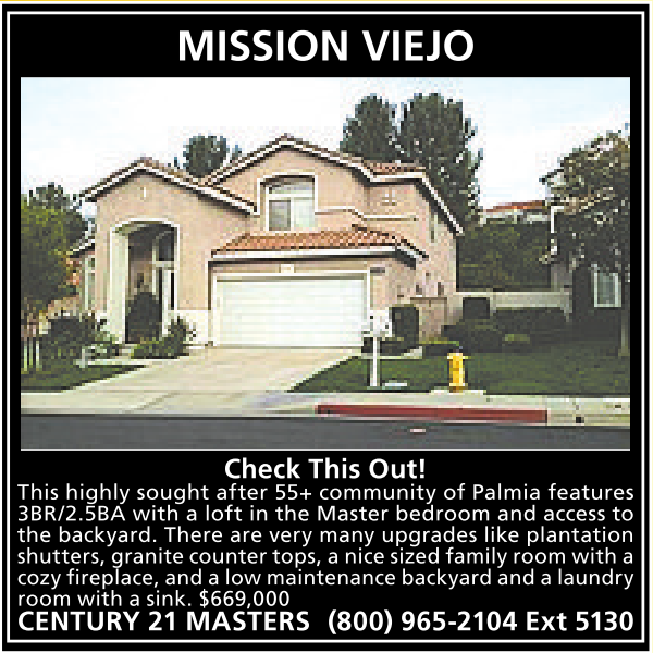 MISSION VIEJO Check This Out! This highly sought after 55+ community of Palmia features 3BR/2.5BA with a loft in the Master bedroom and access to the backyard. There are very many upgrades like plantation shutters, granitecounter tops,anicesizedfamilyroomwitha cozy fireplace,and alow maintenance backyard andalaundry room with asink. $669,000 CENTURY 21 MASTERS (800) 965-2104 Ext 5130 See also