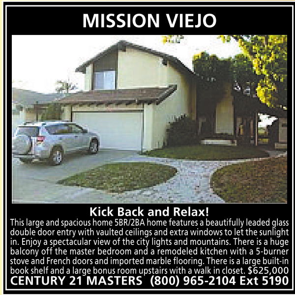 MISSION VIEJO Kick Back and Relax! This largeand spacious home 5BR/2BA home features abeautifully leaded glass double door entrywithvaultedceilingsand extrawindows to letthe sunlight in. Enjoy aspectacular view ofthe city lights and mountains. There isahuge balcony off the master bedroom and aremodeled kitchen with a5-burner stoveand Frenchdoors andimportedmarble flooring. Thereisalarge built-in book shelf and alarge bonus room upstairs with awalk in closet. $625,000 CENTURY 21 MASTERS (800) 965-2104 Ext 5190 See also