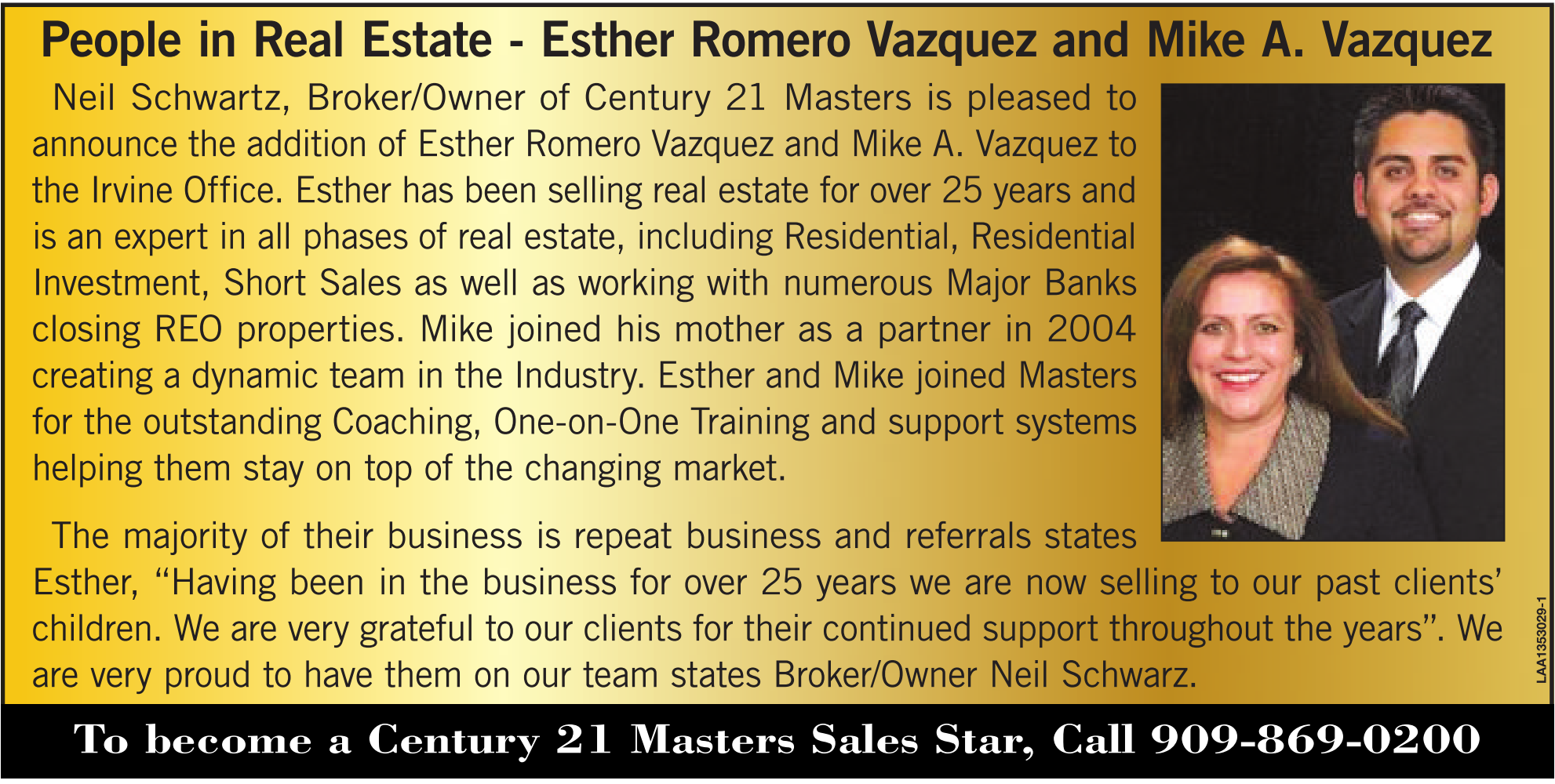 People in Real Estate - Esther Romero Vazquez and Mike A. Vazquez Neil Schwartz, Broker/Owner of Century 21 Masters is pleased to announce the addition of Esther Romero Vazquez and Mike A. Vazquez to the Irvine Office. Esther has been selling real estate for over 25 years and is an expert in all phases of real estate, including Residential, Residential Investment, Short Sales as well as working with numerous Major Banks closing REO properties. Mike joined his mother as a partner in 2004 creating a dynamic team in the Industry. Esther and Mike joined Masters for the outstanding Coaching, One-on-One Training and support systems helping them stay on top of the changing market. The majority of their business is repeat business and referrals states Esther, “Having been in the business for over 25 years we are now selling to our past clients’ children. We are very grateful to our clients for their continued support throughout the years”. We are very proud to have them on our team states Broker/Owner Neil Schwarz. To become a Century 21 Masters Sales Star, Call 909-869-0200
