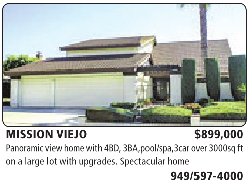 MISSION VIEJO $899,000 Panoramic view home with 4BD, 3BA,pool/spa,3car over3000sq ft on alarge lotwithupgrades. Spectacularhome 949/597-4000