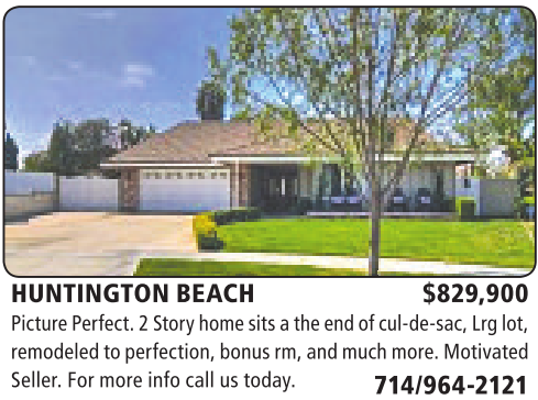 HUNTINGTON BEACH $829,900 PicturePerfect.2Story homesitsathe endofcul-de-sac, Lrglot, remodeledtoperfection, bonus rm,and muchmore.Motivated Seller.For more infocallustoday. 714/964-2121