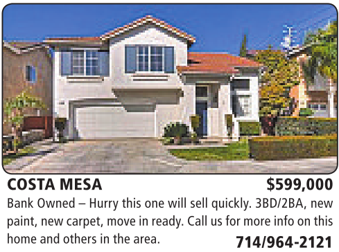 COSTA MESA $599,000 Bank Owned –Hurry this one will sell quickly. 3BD/2BA, new paint,new carpet,move in ready. Call us formore infoonthis homeand othersinthe area. 714/964-2121