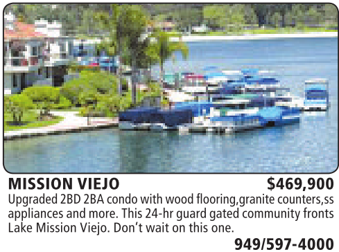 MISSION VIEJO $469,900 Upgraded 2BD2BA condowithwood flooring,granite counters,ss appliances andmore.This 24-hrguard gatedcommunity fronts Lake MissionViejo.Don’t waitonthis one.