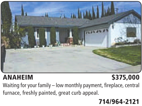 ANAHEIM $375,000 Waitingfor your family –low monthly payment, fireplace,central furnace, freshlypainted, great curb appeal.
