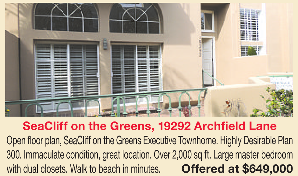 SeaCliff on the Greens, 19292 Archfield Lane Open floor plan, SeaCliff on the Greens Executive Townhome. Highly Desirable Plan 300. Immaculate condition, great location. Over 2,000 sq ft. Large master bedroom with dual closets. Walk to beach in minutes. Offered at $649,000