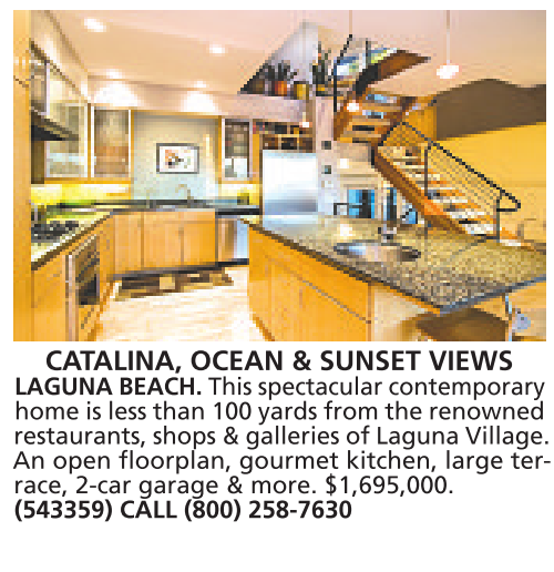 CATALINA, OCEAN & SUNSET VIEWS LAGUNA BEACH. This spectacular contemporary home is less than 100 yards from the renowned restaurants, shops&galleries of Laguna Village. An open floorplan, gourmet kitchen, large terrace, 2-car garage & more. $1,695,000. (543359) CALL (800) 258-7630