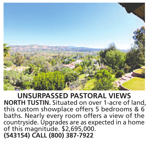 UNSURPASSED PASTORAL VIEWS NORTH TUSTIN. Situated on over 1-acre of land, this custom showplace offers 5 bedrooms & 6 baths. Nearly every room offers a view of the countryside. Upgrades are as expected in ahome of this magnitude. $2,695,000. (543154) CALL (800) 387-7922
