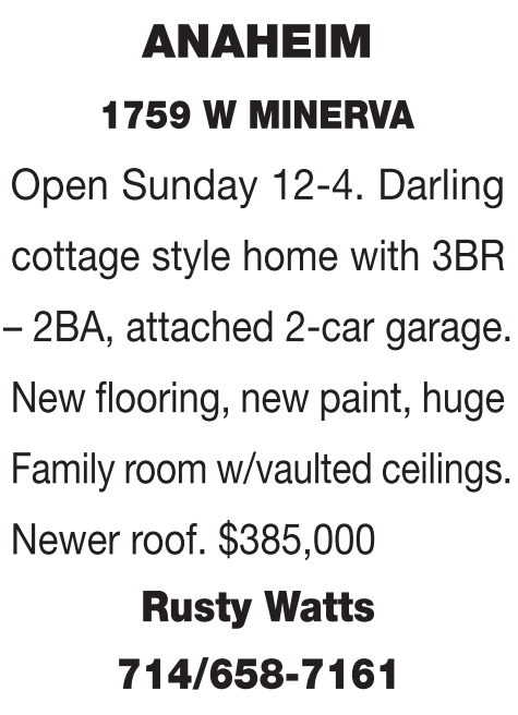 New flooring, new paint, huge Family room w/vaulted ceilings. Newer roof. $385,000 Rusty Watts 714/658-7161