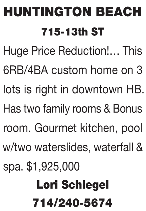 Huge Price Reduction!… This 6RB/4BA custom home on 3 lots is right in downtown HB. Has two family rooms & Bonus room. Gourmet kitchen, pool w/two waterslides, waterfall & spa. $1,925,000 Lori Schlegel 714/240-5674