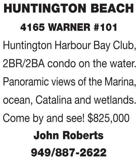 Huntington Harbour Bay Club, 2BR/2BA condo on the water. Panoramic views of the Marina, ocean, Catalina and wetlands. Come by and see! $825,000 John Roberts 949/887-2622