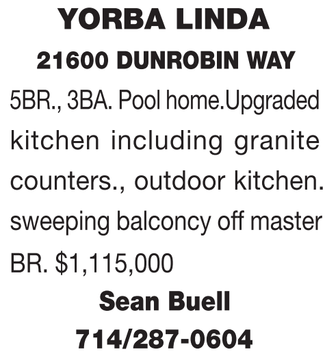 5BR., 3BA. Pool home.Upgraded kitchen including granite counters., outdoor kitchen. sweeping balconcy off master BR. $1,115,000 Sean Buell 714/287-0604