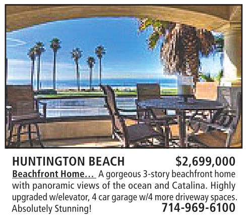 HUNTINGTON BEACH $2,699,000 BeachfrontHome… Agorgeous 3-story beachfronthome with panoramic views of the ocean and Catalina. Highly upgraded w/elevator, 4car garagew/4 more driveway spaces. AbsolutelyStunning! 714-969-6100