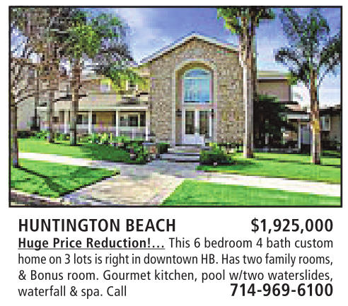 HUNTINGTON BEACH $1,925,000 Huge Price Reduction!… This 6bedroom 4bath custom homeon3lotsisright in downtown HB.Has twofamilyrooms, &Bonus room. Gourmet kitchen, pool w/two waterslides, waterfall&spa. Call 714-969-6100
