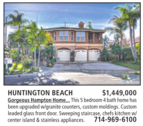 HUNTINGTON BEACH $1,449,000 GorgeousHamptonHome... This 5bedroom4bathhome has beenupgraded w/granite counters,custommoldings.Custom leaded glassfrontdoor. Sweepingstaircase,chefskitchen w/ centerisland&stainlessappliances. 714-969-6100