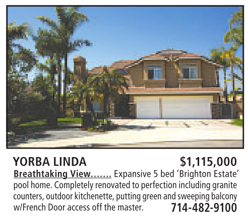 YORBA LINDA $1,115,000 Breathtaking View……. Expansive 5bed ‘Brighton Estate’ poolhome.Completelyrenovatedtoperfectionincluding granite counters, outdoorkitchenette,putting greenand sweepingbalcony w/French Door access offthe master. 714-482-9100