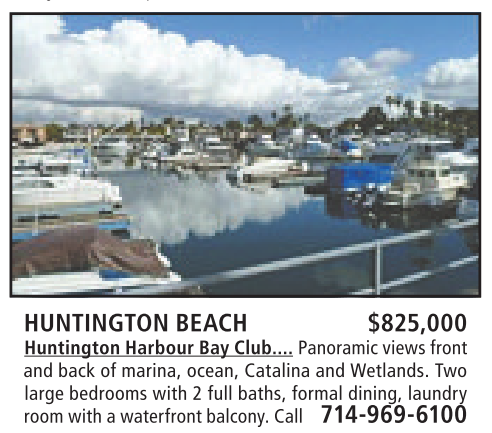 HUNTINGTON BEACH $825,000 Huntington Harbour Bay Club.... Panoramic viewsfront and back of marina, ocean, Catalina and Wetlands. Two large bedrooms with 2full baths, formal dining, laundry room with awaterfrontbalcony.Call 714-969-6100