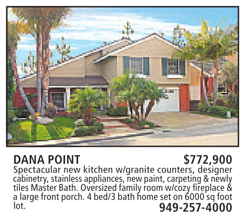 DANA POINT $772,900 Spectacular new kitchen w/granite counters, designer cabinetry,stainlessappliances,new paint,carpeting &newly tilesMasterBath. Oversizedfamilyroomw/cozyfireplace& alarge frontporch. 4bed/3 bath homeset on 6000 sq foot lot. 949-257-4000