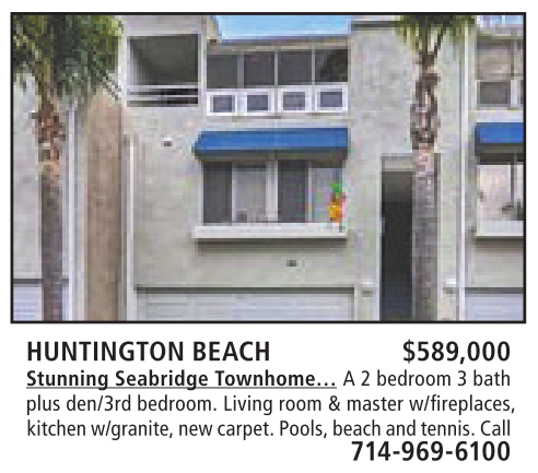 HUNTINGTON BEACH $589,000 Stunning Seabridge Townhome… A2bedroom 3bath plus den/3rd bedroom. Living room &master w/fireplaces, kitchen w/granite,new carpet.Pools,beachand tennis.Call 714-969-6100
