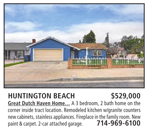 HUNTINGTON BEACH $529,000 Great Dutch Haven Home… A3bedroom, 2bath home on the corner inside tract location. Remodeled kitchen w/granite counters newcabinets, stainlessappliances. Fireplace in thefamilyroom. New paint &carpet. 2-carattached garage. 714-969-6100