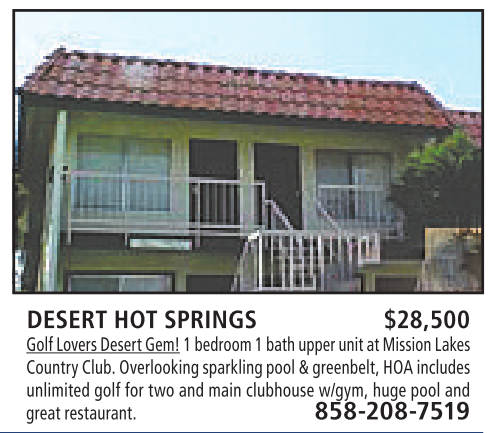 DESERT HOT SPRINGS $28,500 Golf Lovers DesertGem!1bedroom1bathupper unit at Mission Lakes CountryClub. Overlooking sparklingpool&greenbelt, HOAincludes unlimited golf for two and main clubhouse w/gym, huge pool and great restaurant. 858-208-7519